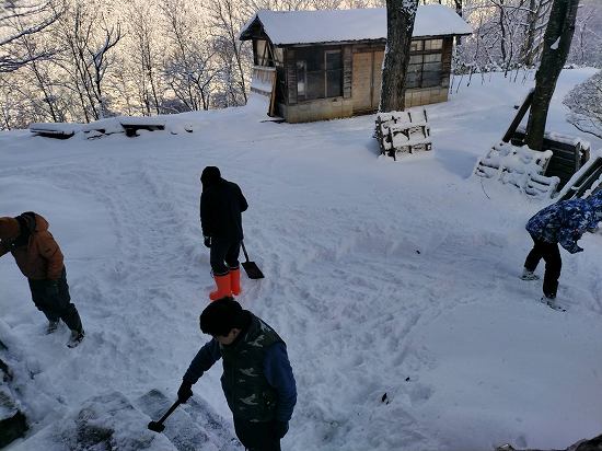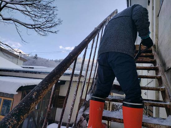 本日午前の作業は、お風呂掃除に皿洗いと非常階段の氷除去!