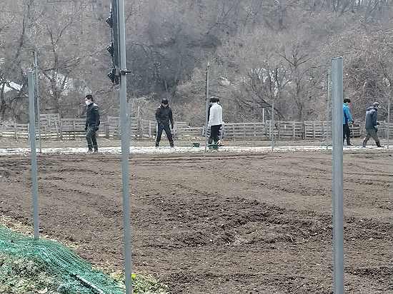 午後は、畑で肥料撒きと柵とネットを引き上げを行いました(^.^)