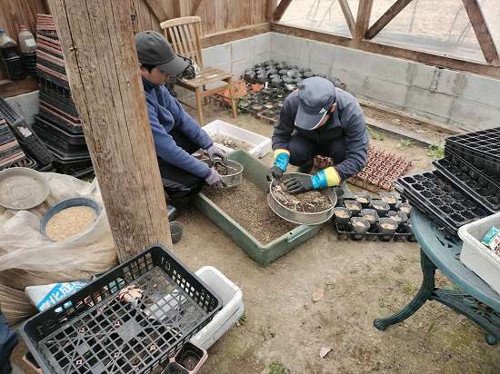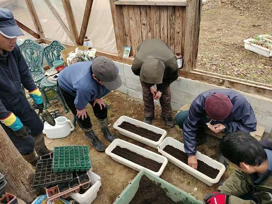 本日午前の作業は、ジャガイモの選別、種まき!